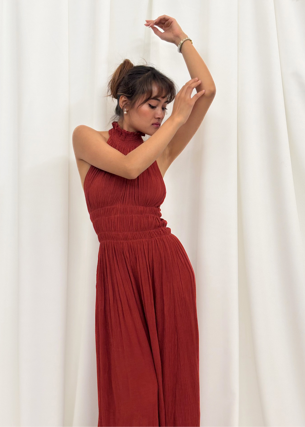 Slip into warm-weather charm with the Amara Dress in rich Rust. Crafted from breezy, crinkled cotton-mix, this midi dress features a flattering smocked bodice and flirty halter neck with soft frill detailing. With its relaxed, comfy fit and on-trend earthy tone, it's the perfect pick for resort getaways, brunch dates, or casual summer evenings.