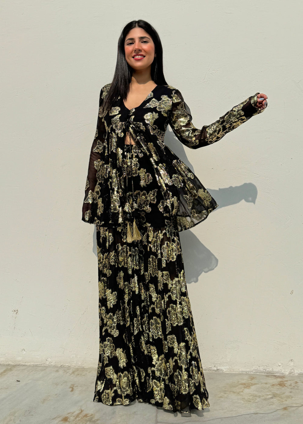 Stand out in the crowd in this special outfit! A gorgeous full sleeve black kurta featuring gold woven flowers, has a front tie up and hook and eye closing; paired with super flared sharara pants. Half cotton lining in both top and bottom.